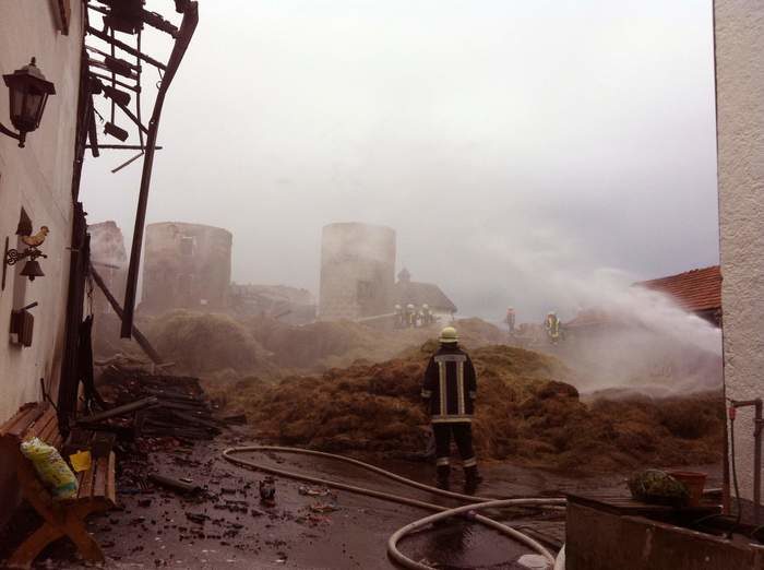 Bei Eintreffen an der Einsatzstelle wurde unser Tanklöschfahrzeug nahe der Einsatzstelle zur Wasserversorgung für die Drehleiter Zwiesel platziert. Die Mannschaft vom LF 10/6 wurde mit dem Verlegen einer längeren Schlauchleitung beauftragt (Wasserentnahme aus offenem Gewässer). Nach dem Legen der Schlauchleitung mussten wir das lodernde Heu, das von einem Bagger großflächig verteilt wurde, löschen.